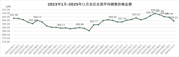 11月份,三种硅酸盐水泥全区平均销售价格为399.23元/吨,环比价格下降1.28%,同比价格略涨0.35%。