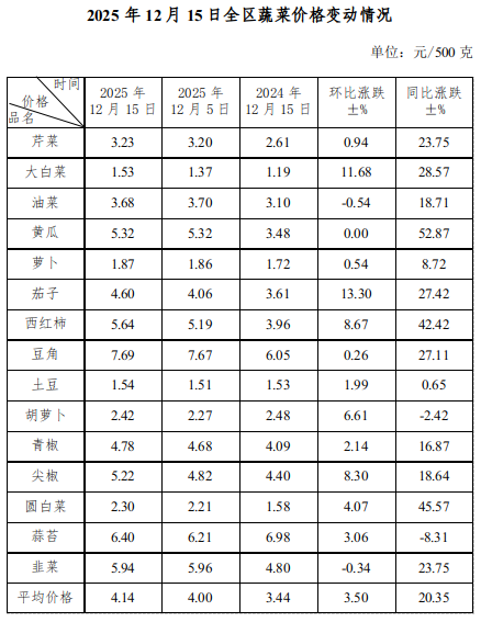 12月15日,全区蔬菜综合平均零售价格为4.14元/500克,环比上涨3.50%。本旬监测的15种蔬菜品种价格12涨2降1持平,上涨幅度占前五位的品种为茄子、大白菜、西红柿、尖椒、胡萝卜,分别上涨13.30%、11.68%、8.67%、8.30%、6.61%。与去年同期相比,15个蔬菜品种综合平均零售价格上涨20.35%。