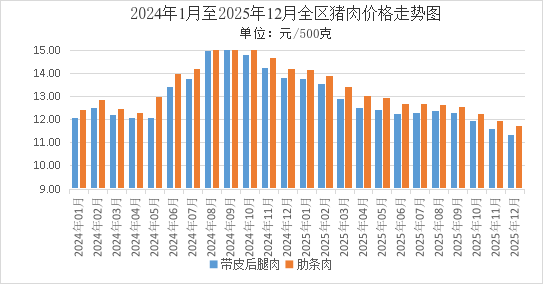 12月份,我区猪肉价格下降。其中猪带皮后腿肉价格12月份各旬环比降幅分别为-0.35%、-1.05%、-0.44%,猪肋条肉价格各旬环比降幅分别为-0.51%、-0.09%、-0.77%。猪带皮后腿肉、猪肋条肉12月全区平均零售价格分别为每500克11.35元、11.72元。环比,猪带皮后腿肉、猪肋条肉价格分别下降2.16%、1.84%。同比,猪带皮后腿肉、猪肋条肉价格分别下降17.87%、17.46%。