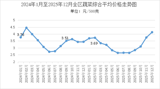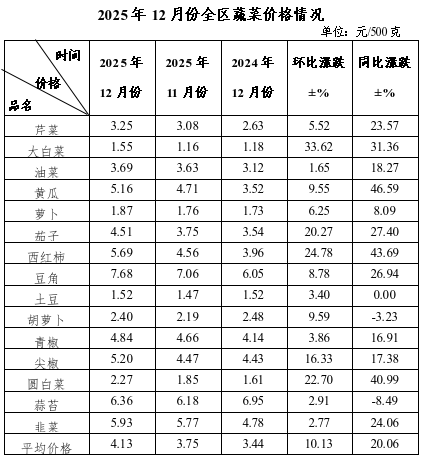 12月份,我区蔬菜价格上涨。全区蔬菜综合平均零售价格为4.13元/500克,环比上涨10.13%。监测的15种蔬菜品种价格均有所上涨,上涨幅度居前的品种为大白菜、西红柿、圆白菜、茄子、尖椒,分别上涨33.62%、24.78%、22.70%、20.27%、16.33%。同比,15个蔬菜品种综合平均零售价格上涨20.06%。