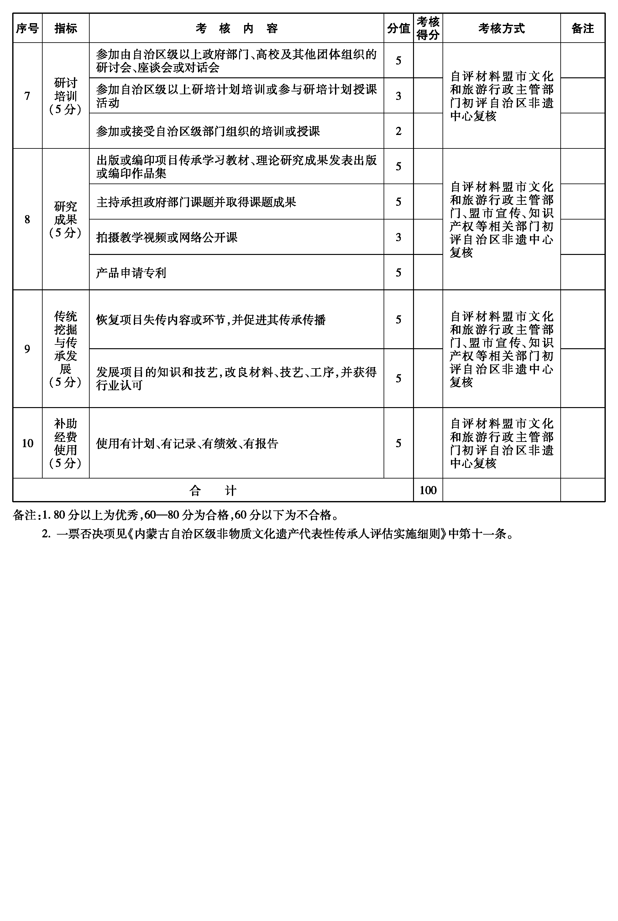 第四条 自治区文化和旅游厅负责自治区级传承人评估工作管理,制定《内蒙古自治区级非物质文化遗产代表性传承人传承活动评估指标》(以下简称评估指标),作为评估依据。评估指标应当包括以下内容: