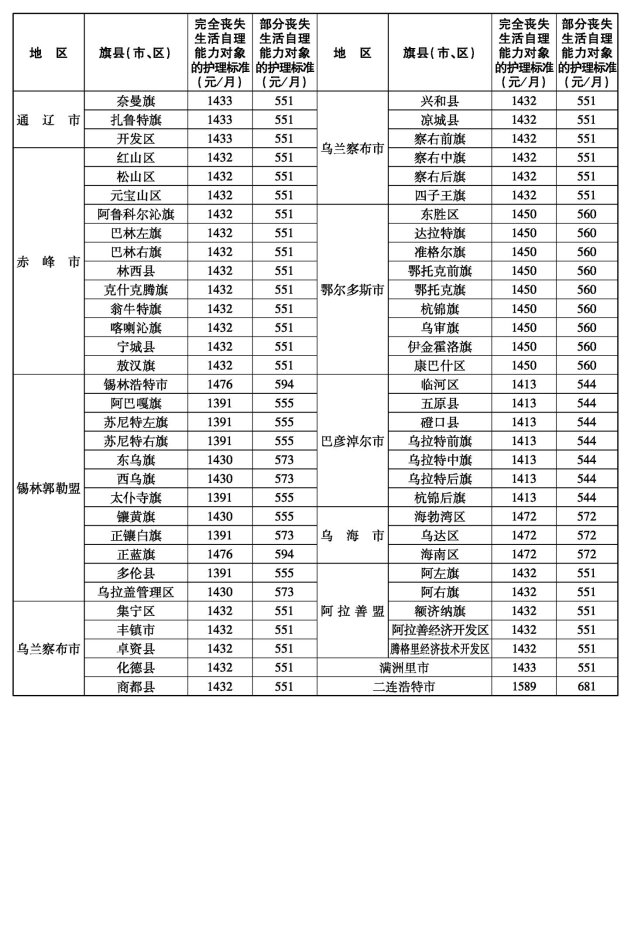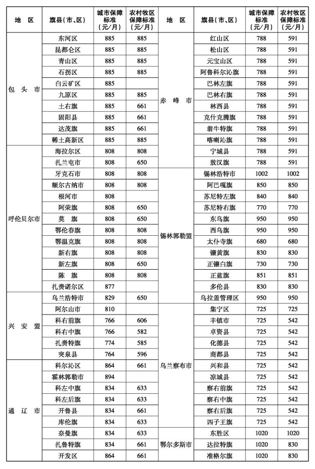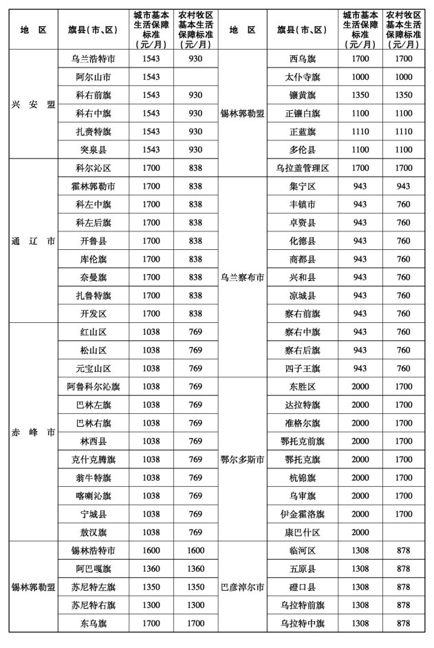 自治区人民政府确定的2025年社会救助标准自2025年6月起执行(各盟市执行标准详见附件),各地区要及时向社会公布,同时做好政策宣传解读。本年度内,如需再次调整社会救助标准必须按有关程序上报,经自治区人民政府批准后执行。相关地区要做好保障标准提高后新申请城乡低保、特困对象的家庭收入测算和原有低保、特困对象补助标准的提高等工作,确保应保尽保。有条件的地区要进一步推进社会救助城乡统筹发展,合理缩小城乡差距,让困难群众及时共享经济社会发展成果。