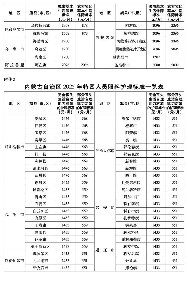 2.内蒙古自治区2025年特困人员基本生活标准一览表