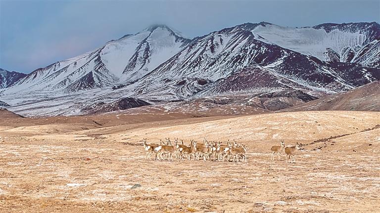 冬日,国家二级保护野生动物藏原羚在甘肃省阿克塞县阿勒腾乡哈尔腾草原活动觅食。新华社发