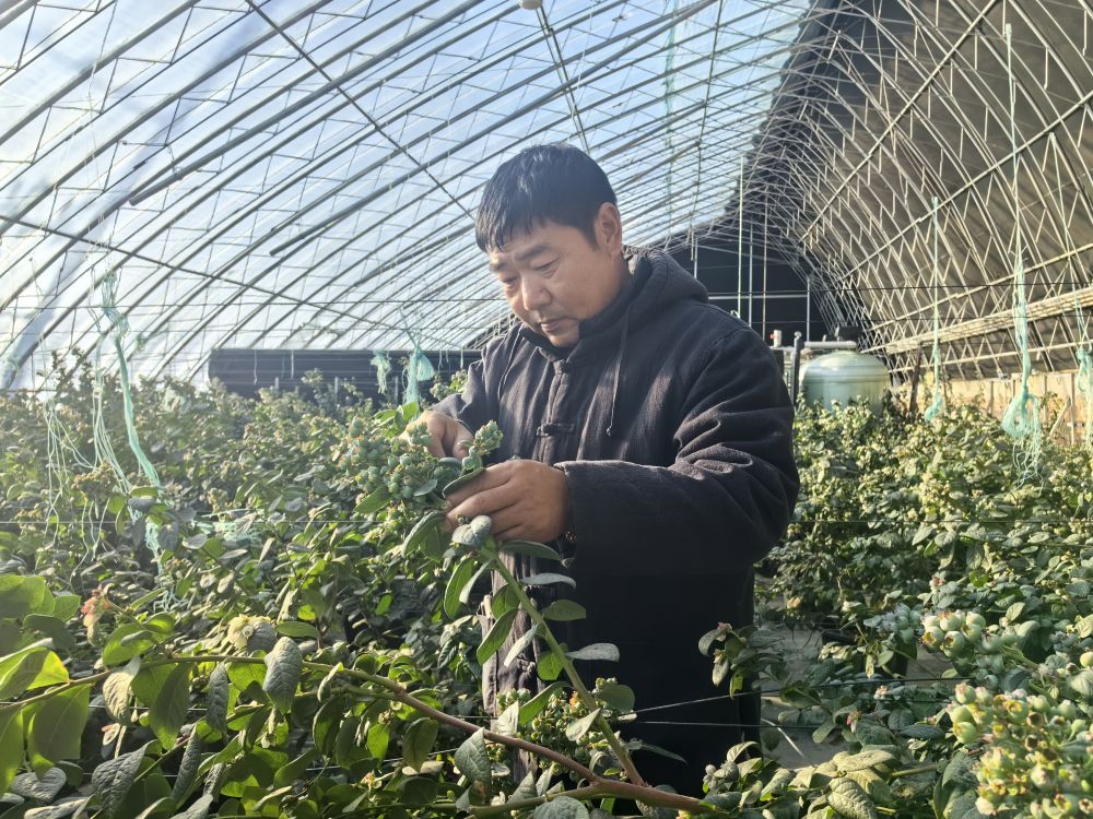 这是内蒙古通辽市科尔沁区的一名种植户在查看蓝莓长势。(董欣扬 摄)